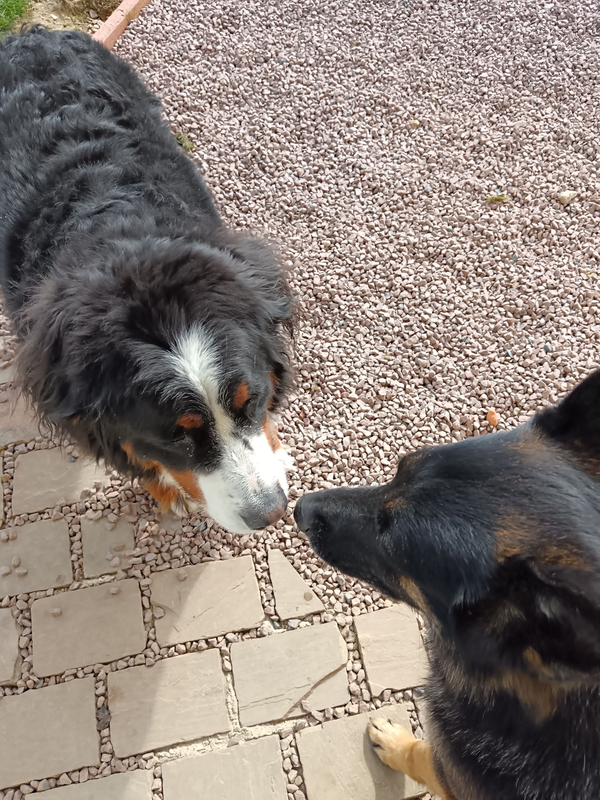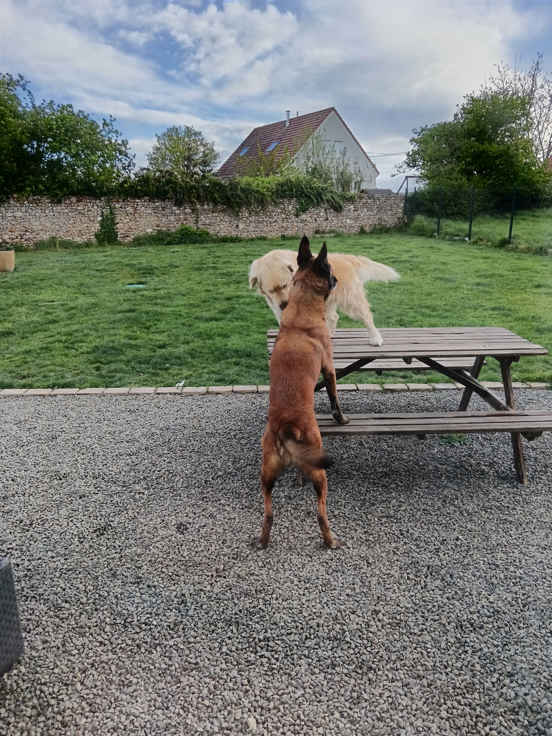 Votre ou vos chiens vivent avec nous, dans la maison et le jardin, le tout sur un terrain de 975 m². Tout le terrain est clôturé.